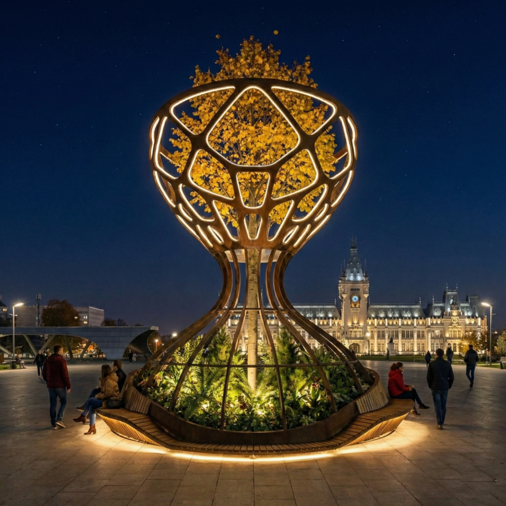 A pornit de la dorința de a traduce vizual mesajul Strategiei Iași 2035 și al Coaliției Iași NetZero City de promovare a neutralității climatice, pentru un Iași mai bun, mai sustenabil. Depășind propunerile convenționale, am căutat un concept la înălțimea ambițiilor orașului. Rezultatul: primul landmark urban biotehnologic al orașului, o instalație care unește două identități ale Iașului: orașul romantic și istoric, simbolizat de tei, și orașul inovator, reprezentat de clepsidra modernă și de componenta tech – senzori conectați la un sistem reactiv de iluminare LED. Nu e un monument, ci un sistem. Nu e o declarație, ci o conversație permanentă între natură, tehnologie și comunitate.